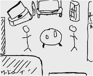 先是画了小棍人(…多,多形象的叫法= =;)面对着壁橱,下方是门,注名まるたん,因为看起来就像是躺倒在地,便被米说是【案发现场】,于是王子把那个名字改成自己,又在床上画了小棍人作为まるたん,「僕はちょっと、ひっそりと、横を向きながら寝ている(*′▽`*)」
